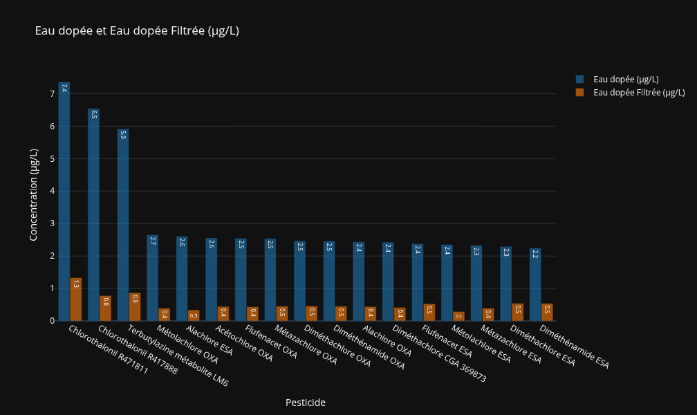 Une eau dopée avec ces pesticides est analysée puis est passée par le filtre puis de nouveau analysée. (Voir résultats d'analyse PDF : Eau dopée et eau dopée filtrée).