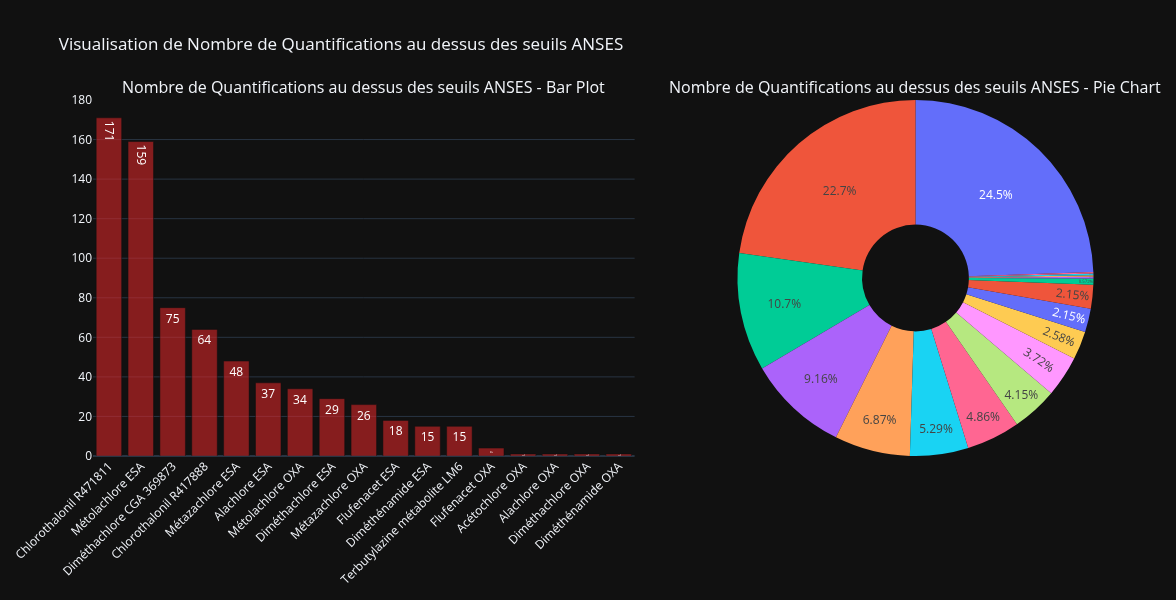 Les composés les plus préoccupants sont le Chlorothalonil R471811 et le Métolachlore ESA, avec près de la moitié des quantifications de non conformité pour ces deux composés uniquement. (Graphique ci-dessus)