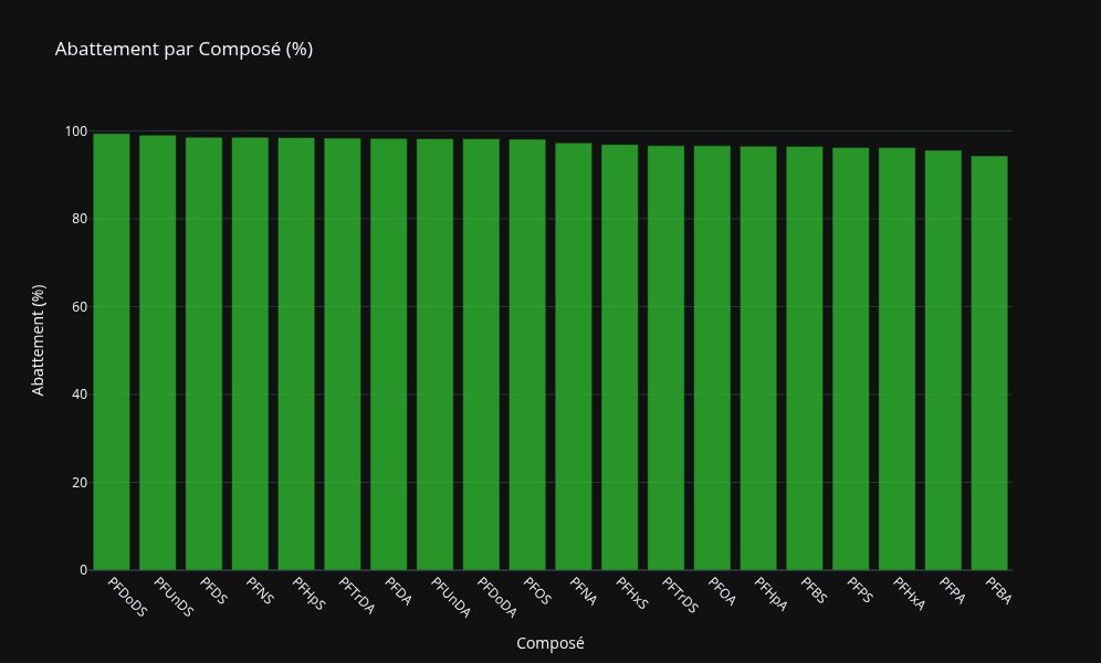 - Abattement de PFAS : 97% de réduction sur la somme des PFAS (chaînes courtes et chaînes longues)