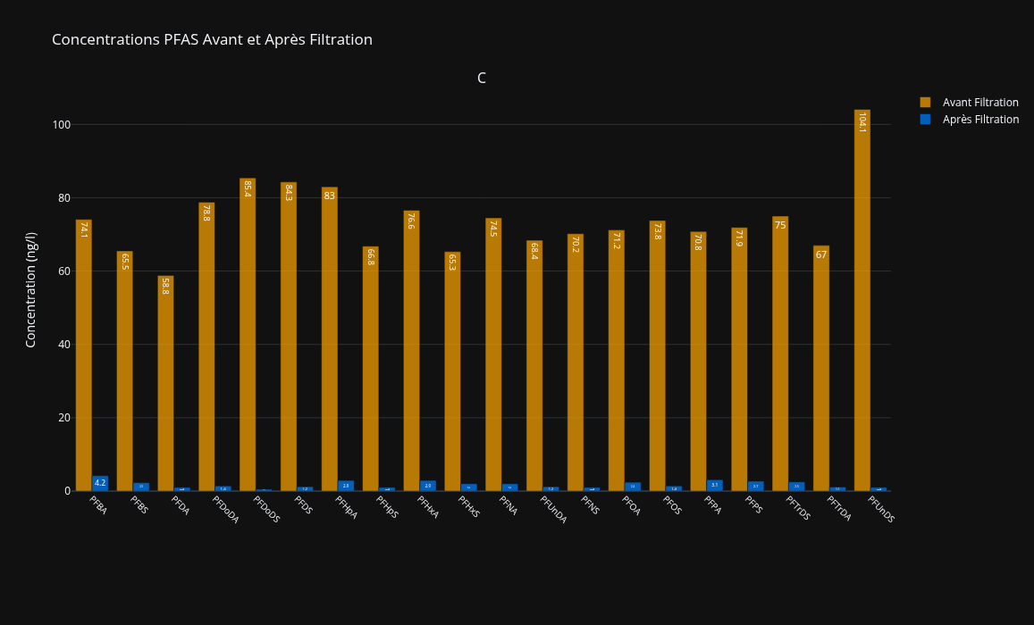 - Efficacité constante : 100 % des échantillons filtrés respectent les seuils, même avec les Concentrations Maximales relevées en France.